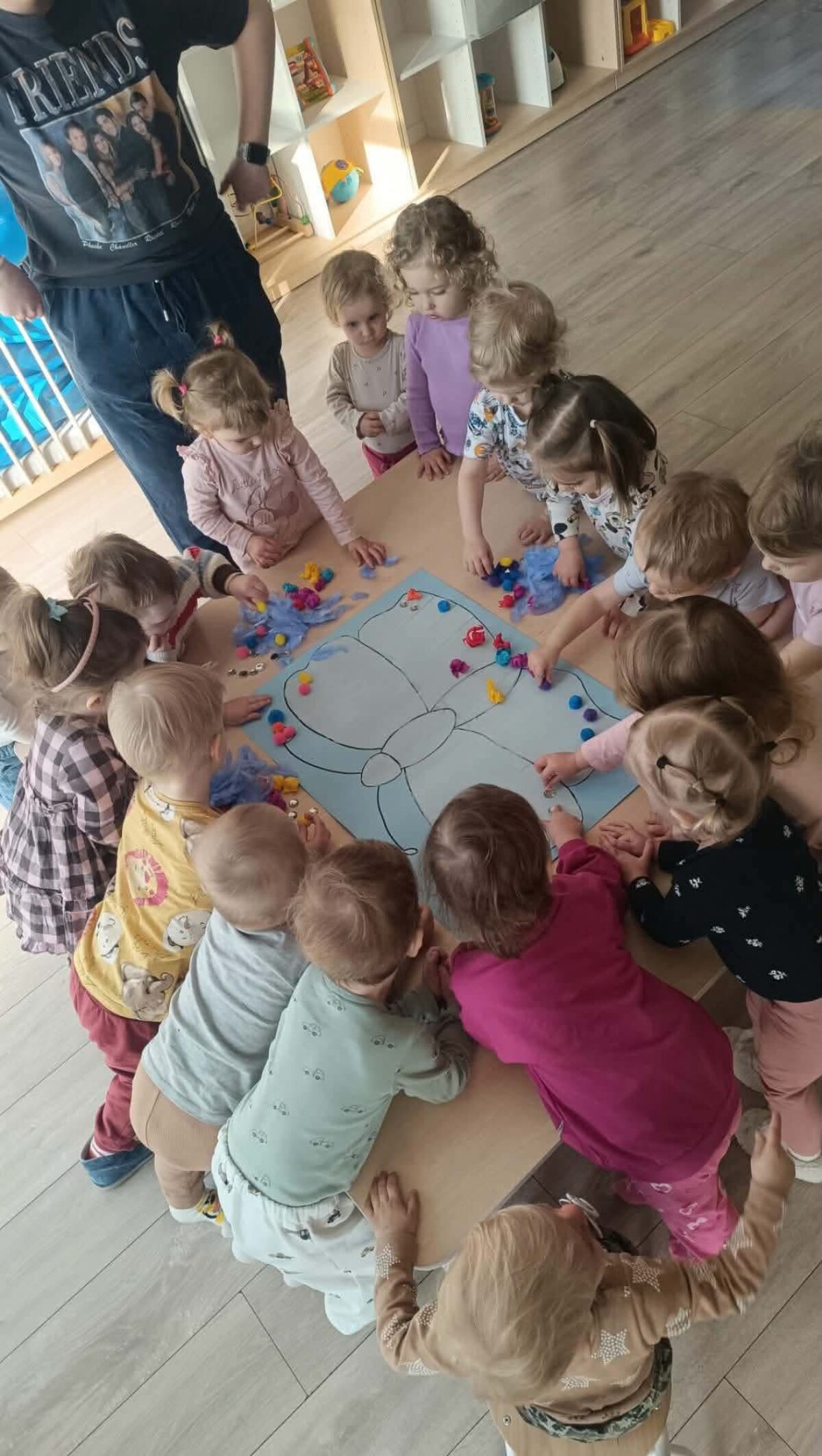 Pani praktykantka pod okiem opiekunek przeprowadziła z dziećmi zajęcia plastyczne polegające na wyklejaniu motyla różnorodnymi kolorowymi ozdobami. Dzieci miały do dyspozycji m.in. kolorowy papier, bibułę, naklejki oraz inne dekoracyjne materiały. Podczas pracy rozwijały swoją kreatywność, sprawność manualną oraz umiejętność rozpoznawania kolorów. Praktykantka wspierała dzieci w wykonywaniu zadania, zachęcała do samodzielności oraz dbała o miłą i bezpieczną atmosferę podczas zajęć.